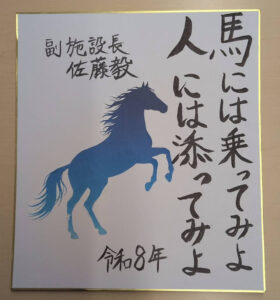 利用者様には、職員が手作りしたダルマの折り紙に「目入れ」ならぬ「顔入れ」をしていただき、それぞれ願い事を書いてもらいました。